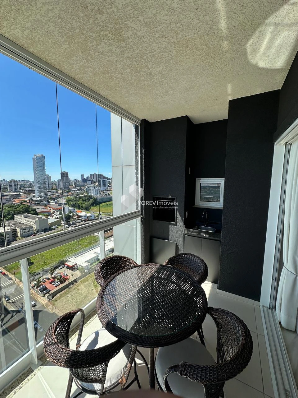 - Sacada com churrasqueira e guarda corpo de vidro, proporcionando uma vista deslumbrante da cidade